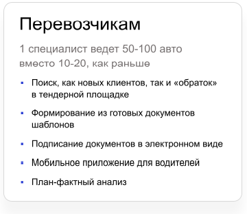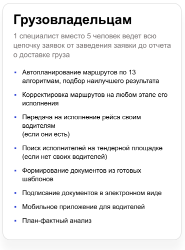 Цель проекта – создать единую цифровую платформу для всех участников логистических процессов: грузовладельцев и перевозчиков. Платформа позволит пользователям решать широкий спектр логистических задач от поиска груза или перевозчика до подписания документов на оплату.